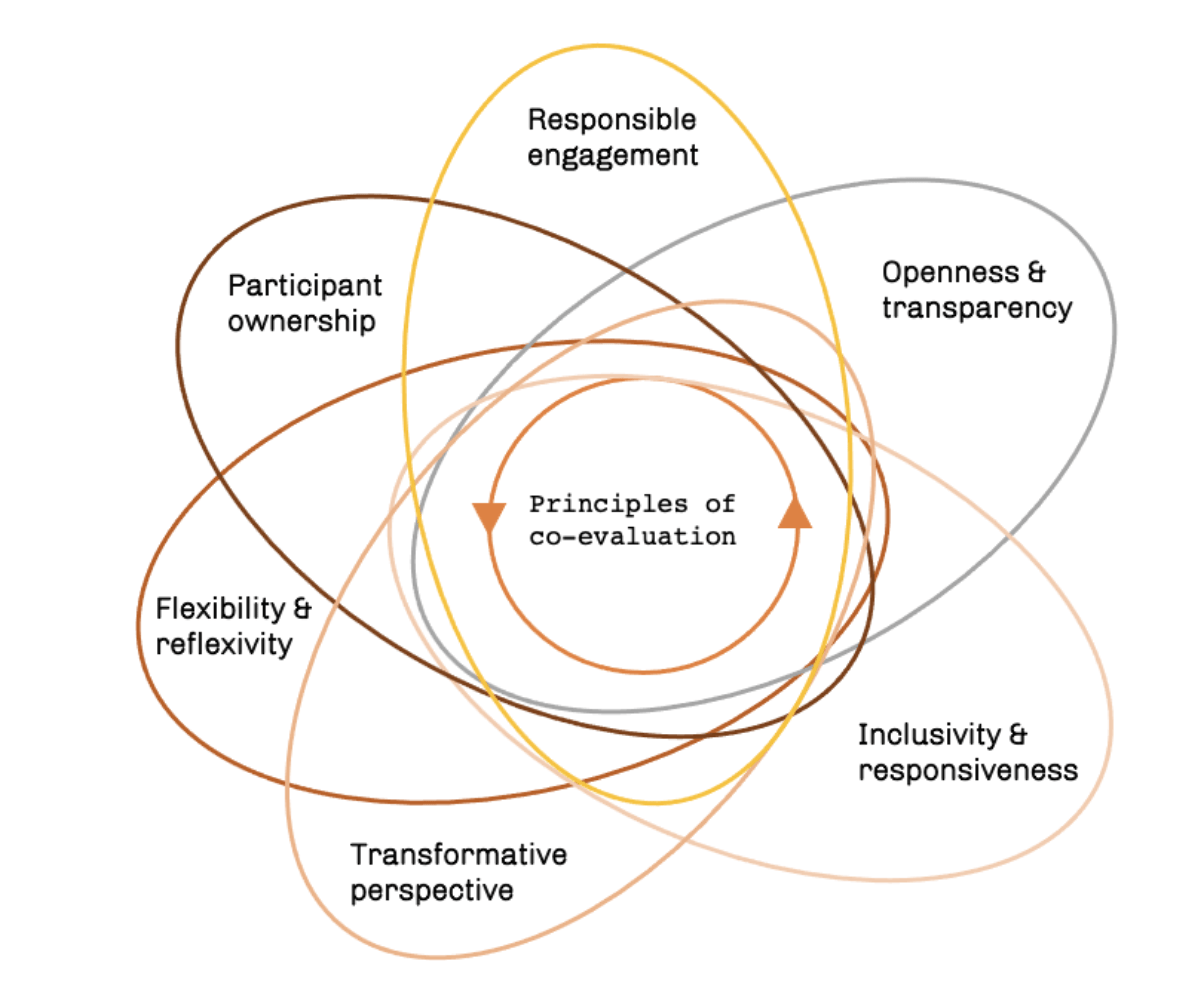 This work is based on the experiences made during 30 months of implementing participatory evaluation practices in the citizen social science project CoAct. The co-evaluation approach was introduced and applied in collaboration with the local research teams across three initiatives that address global social concerns (youth employment, mental healthcare, and environmental justice). Based on these experiences, we derived a set of 6 principles that we identified as highly relevant for the implementation of co-evaluation practices in citizen social science.Â
